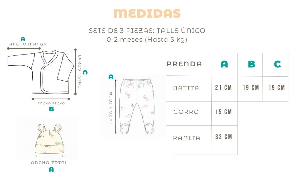 El set de 3 piezas de excelente calidad incluye una batita, una ranita y un gorrito, diseñados para brindar comodidad, protección y suavidad desde los primeros días del bebé. Cada prenda combina practicidad y estilo, formando un conjunto completo y delicado.