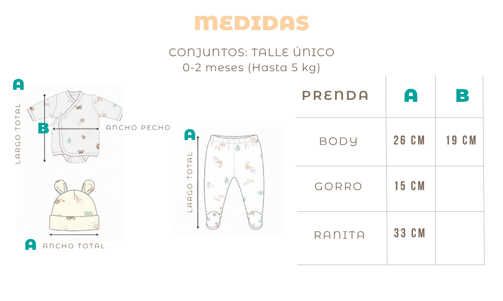 El conjunto incluye un body con cierre a presión, una ranita cómoda con cintura elástica y un gorro a juego, creando una combinación práctica y delicada, ideal para uso diario o para completar el ajuar del recién nacido.